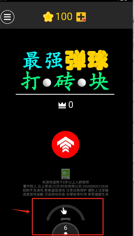 2、游戏主界面是黑色背景,顶部有菜单图标。中间是游戏名称最强弹球打砖块,下方有皇冠和分数显示。