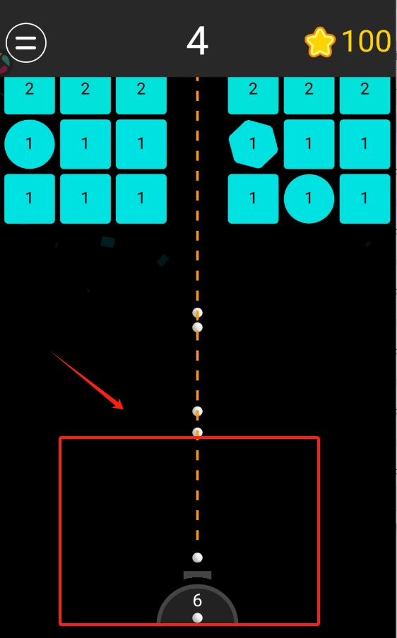 3、关卡数与得分显示于顶部。中间以黄色虚线分隔左右两边,每边各有9个彩色方块。下方有个带数字6的黑色装置,白色小球正沿着上方的虚线向下掉落。