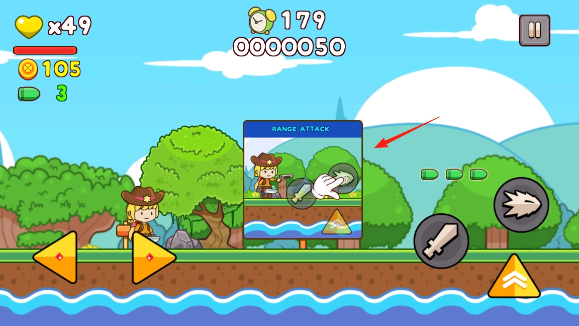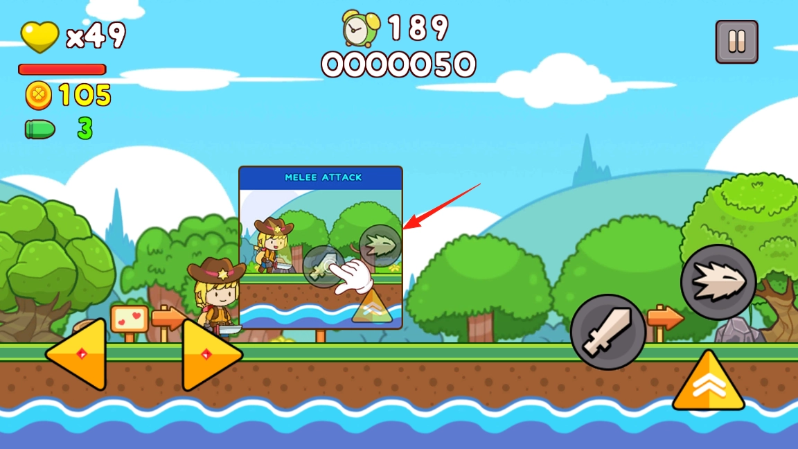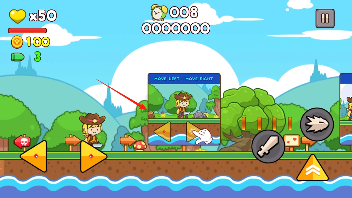 1. 踏入牛仔超人的世界,按照提示,点击左右移动的按钮,控制角色在地形上行走。借由移动操作,使角色对场景展开探索,避开障碍,推动游戏进程,感受基础移动机制。
