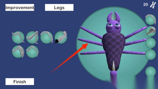 3、进入改造界面,选腿部等部件,消耗DNA,升级昆虫,增强战斗能力。
