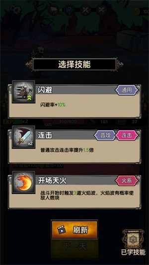 3、当完成事件时,玩家能够获取各类属性加成以及经验值。当经验值累积满额后,角色便会升级。而一旦升级,玩家就能够挑选一项技能来强化自身。