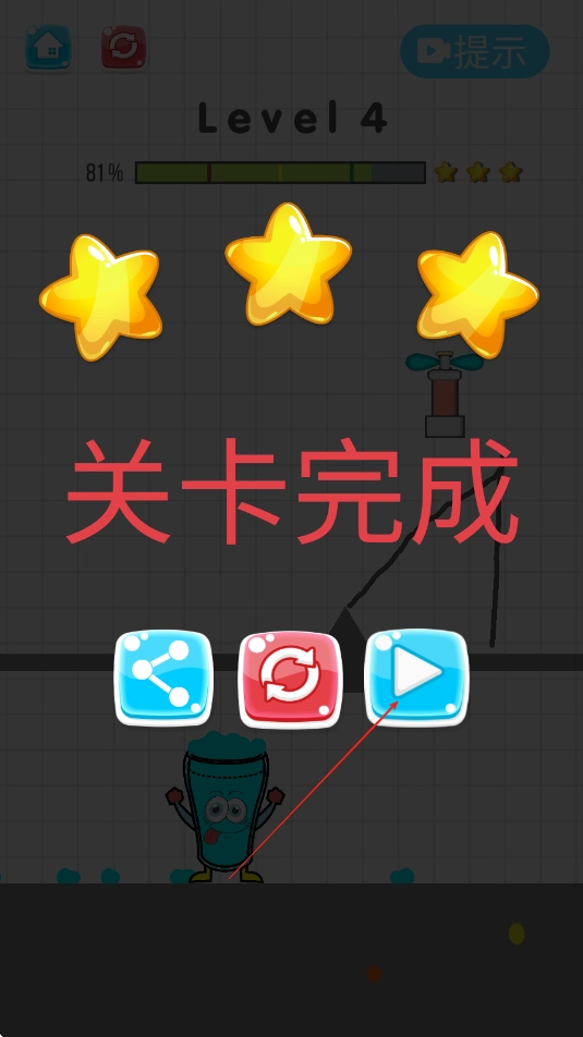 3、当水杯水位达到100%时即可通关,通关后根据画线次数与接水效率获得星星评分,累积星星可解锁沙漠、冰川等主题的特色关卡场景。