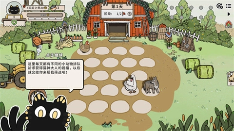 4、进入游戏后,画面如图所示。玩家需要依照引导进行操作,通过点击“新的一天”,从所养殖的动物那里获取金币。待规定天数一到,就给猫神上供。