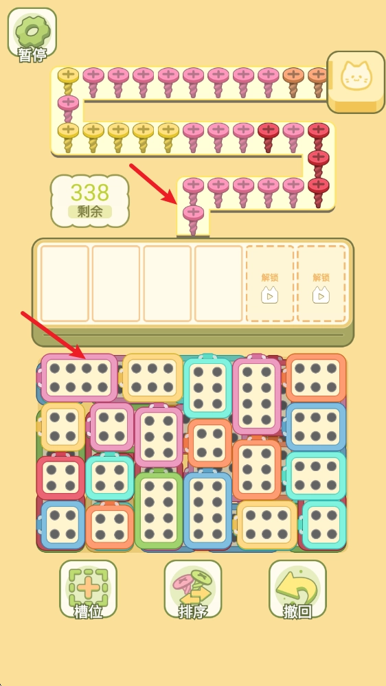 1、当开启挑战后,在界面上方能够看到有着各种颜色的螺丝,而在界面下方则是与螺丝颜色相对应的螺丝盒。