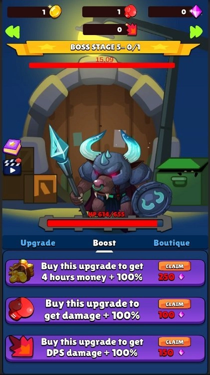 4、在挂机模式里挖掘自身潜力,让每个技能与武器都迅速升级,尽情征战无边界的冒险地图。