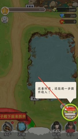 1起初,你会拥有一方小池塘,通过宣传吸引客人前来捕鱼,用所得收益对鱼塘进行升级,进而解锁更多水生生物品种,以提升顾客的体验。