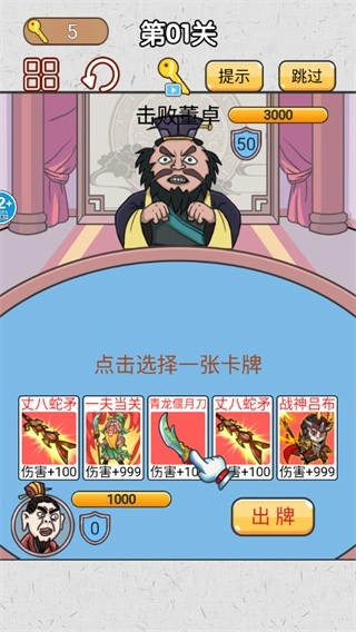 3、游戏中融入了众多网络热梗。玩家进入游戏后,需充分开动脑筋,将关卡里的所有元素与熟知的热梗相结合,以此完成关卡任务,享受十分休闲的三国体验。同时,玩家还能收集各类卡牌,开启爽快的游戏战斗。