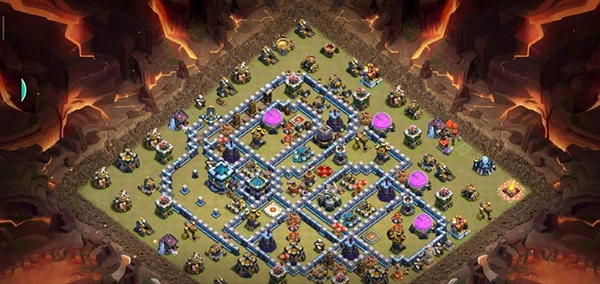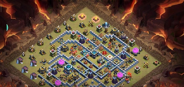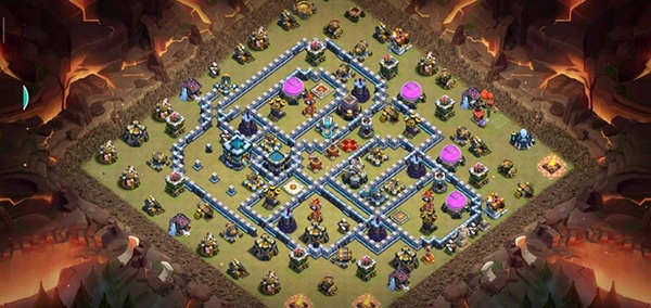 阵型剖析:此乃大本偏向一侧的14本不规则格子阵型,采用菱形布局方式,大本与中心区域分开布置。这种布局在防守放置中颇为常见,对于陆军而言,唯有借助弹跳法术或者地震法术,方可突破该阵型。火焰防御塔分散设置,其中还埋设了5座电磁塔,既能防止敌方清边以及引导部队偏离预定路线,同时也能给敌方造成阻碍。经实际测试,效果极佳,适用于常规的部落战场景。
