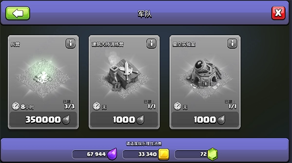 1. 兵营:部队于兵营处安营扎寨,通过搭建及升级兵营,从而能够容纳更多部队。