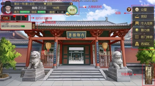 就拿巡抚身份来说,游戏刚开场,老爷们能够四处走走看看,熟悉熟悉游戏的操作以及各种设施。等到游戏内第一年的三月份开启时,会收到进京的邀请。接着前往皇城正门也就是紫禁城,出示腰牌后进入宣政殿,面见圣上领取一年一度的城市发展计划。