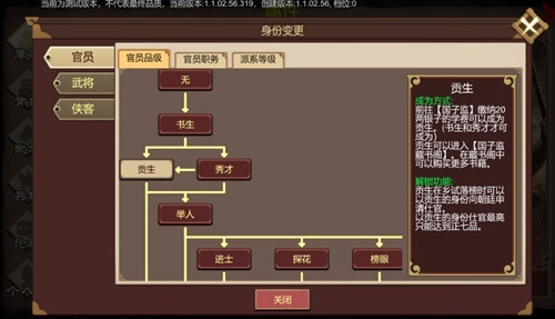 就拿查看级别职务来说,不同身份会对应不同分支。在游戏进程中,当完成任务并满足升级条件后,就能提升自身的品级、职务或者派系等级,进而解锁更多功能。各位老爷们,选好目标方向,专心修炼吧~