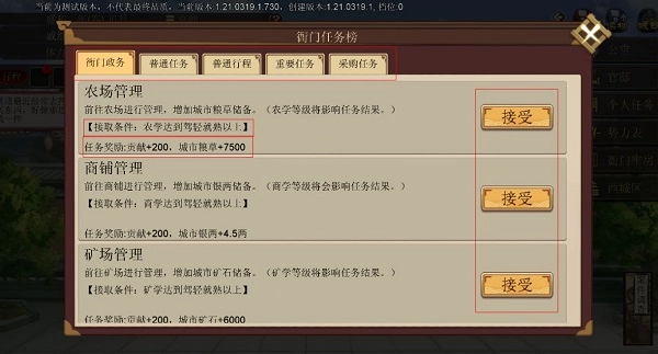 (个人任务 - 衙门任务 - 领取 - 执行任务 - 交付)