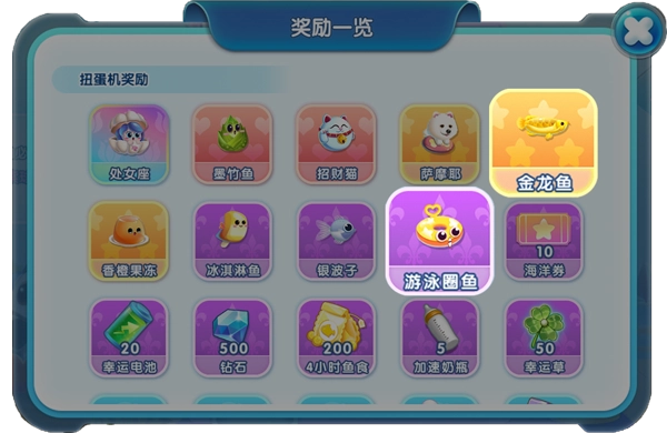游泳圈鱼与金龙鱼均源自扭蛋机,能够同时开展扭蛋操作。