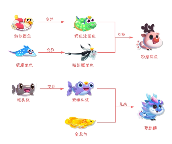 一旦暗黑魔鬼鱼、鳄鱼泳圈鱼、紫锤头鲨变异出其中任意一只,便能够直接进行养殖,此时就可以着手兑换粉麋鹿鱼和蓝麒麟了。