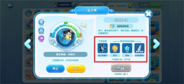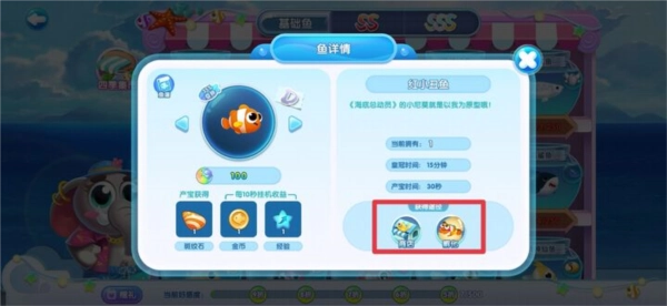 着急的馆长可使用加速剂来加快成长进程。此外,每个阶段的鱼儿都会产出一定数量的经验、金币,以及最为关键的鱼宝。鱼儿处于不同阶段所带来的效益存在差异,具体详情可在鱼详情界面查看,如下: