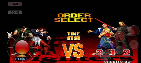 1. 第一步,安装本站所提供的拳皇97安卓单机版游戏。安装完成后,进行投币操作,确认开始游戏,接着挑选我们心仪的英雄。