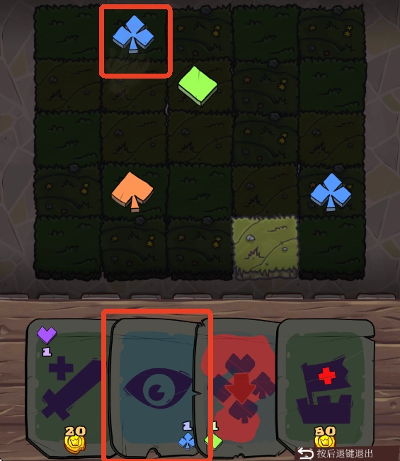 2、点击拾取蓝色符文,如此便能使用透视卡,通过驱散黑雾来探索房间的各个区块,进而获取金币。