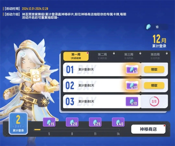 活动期间,肠肠每周只要累计登录,就能获取神秘碎片,而且神秘碎片奖励每周都会更新!另外,每月累计登录达到特定天数,还能得到更多神秘碎片~在本次活动里,肠肠们总共可获得神秘碎片×200 。