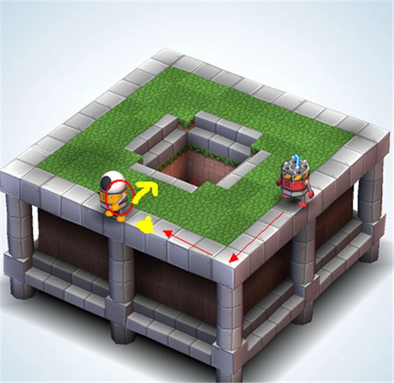 1. 把小黄人挪动至图里的圈圈位置,等候小红人顺着箭头所指方向自动前来。