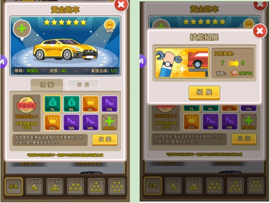 (2)车辆每日可于豪车展开展进修,座驾积累到150经验便能提升1点资质。黄人可搭配6星座驾,不过建议等级较低的人才不要配置,可将其拆解换成拓展卡,再装配到高等级人才身上,如此更为适宜。