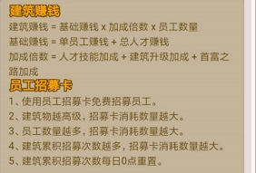 建筑是产生金币的根基,具体公式如图所示,主要涉及倍数与员工数量。