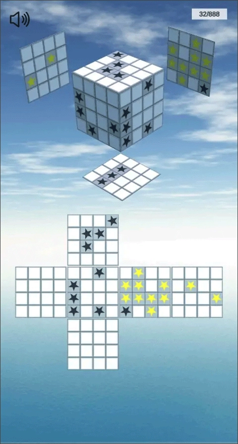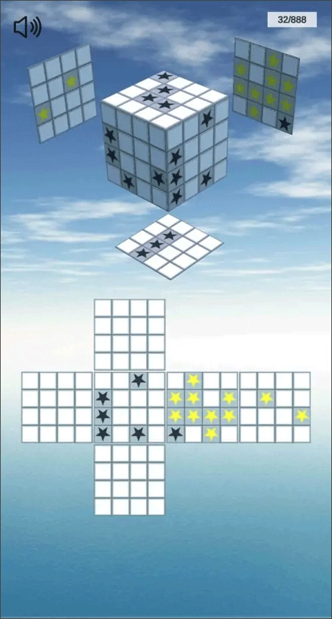 2、这款游戏的目的是提升玩家的空间想象力,关卡设计遵循循序渐进的原则,难度把控适中。在解谜时,玩家只需先在立体图与平面图上,把黄色星星和黑色星星逐一对应起来,将其当作参考系,就能顺利找到答案。随着游戏推进,难度会逐步提高,不过只要选好对照面,再发挥一下自身的想象力,困难便会轻松解决。