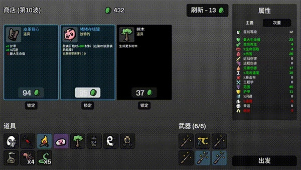 2、通过收集材料迅速获取经验,同时利用一波又一波敌人到来的间隙,在商店有策略地购买道具。