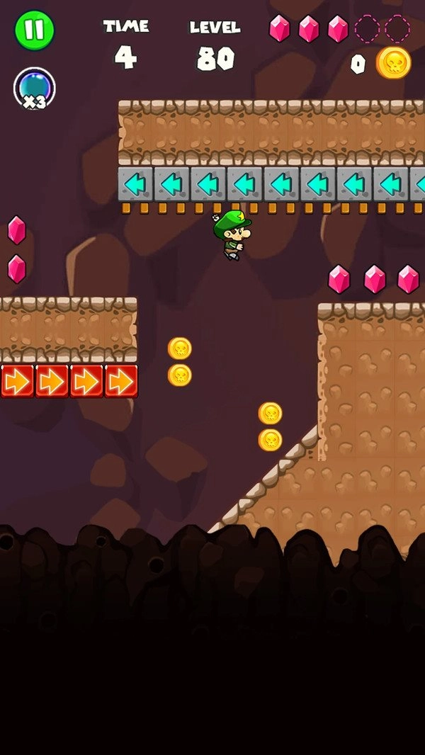 屏幕左下方设有上下左右按钮,用于操控方向。在前行过程中,你得跨越形形色色的障碍,战胜重重危险。