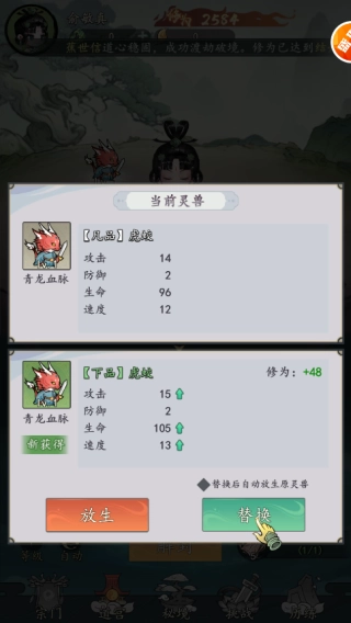 3、若解锁到实力更为强大的同一只灵兽,点击“替换”选项,即可更换上阵的灵兽,以此提升自身实力,同时将原有的灵兽放生,从而获取灵石。