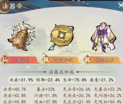 法器包含:混沌钟、落宝金钱以及紫缓仙衣。