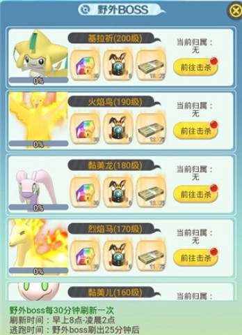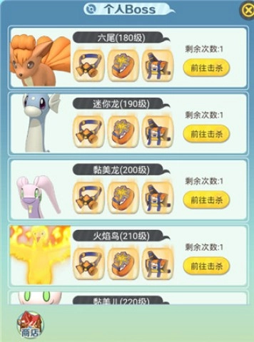 在第三页,设有野外 BOSS。玩家需在特定的时间范围内与 BOSS 展开战斗。要是挑战成功,就能获取钻石、装备以及宝可元。但要是挑战失败,BOSS 便会逃走。而且每次进行挑战,都需要消耗挑战证明书。