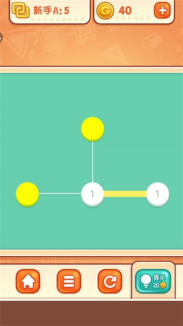 5、在数字连线模式中,需把端点两两相接。每当连接一条线段,该线段两端端点上的数字便会各自减一,当所有端点的数字都减至零,即可通关。