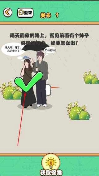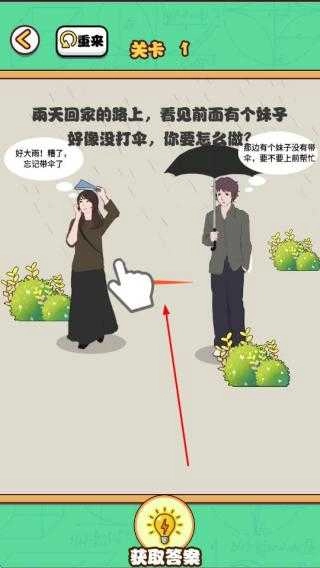 1. 踏入【关卡1】的雨天场景,依照箭头的指示,点击未撑伞的妹子以触发互动。