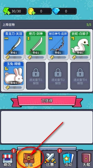 3、在背包界面,能够展示已解锁的上阵武器。