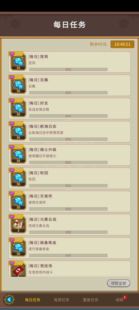 14、在右侧1点钟方向,便是任务大厅。这里陈列着所有任务的清单,并非仅有主线任务,每日任务、每周任务、重复任务以及成就任务也都包含其中。而且,任务设有时间限制,到期后会重新分配新任务。除成就任务外,其他任务皆可一键领取全部任务奖励。