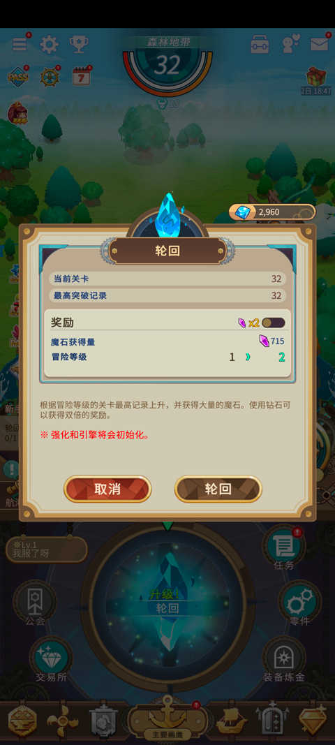 11、在主要画面的下方,有一个十分醒目的蓝色水晶标识,其代表着轮回功能。通过这个轮回功能,你当前角色的等级、飞艇的强化状态等所有相关设定都会被重置为初始状态,让你重新回到起点。此后,你可以去挑战更高级的怪物,获取更优质的资源,进而再次对角色和飞艇进行强化、升级以及升星操作。