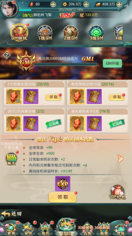 1. 初次登录游戏,即可免费领取1 - 20级的VIP大礼包,后续通过做任务还能提升GM等级,游戏开局就是这么畅快!