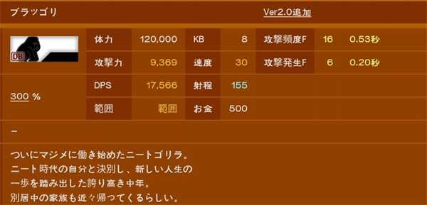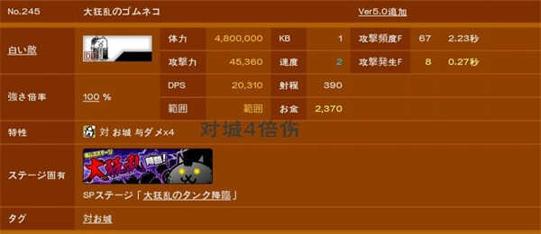 此单位具备超高伤害,射程较远,攻击频率也不低,射程低于390的单位基本难以触及。量产的炮灰单位,它一击就能消灭。多数人在攻打大狂墙时,很难拥有真正能稳住场面的炮灰。不过,经测试发现,60级左右满生命本能且加上体力联组的拉面王,能够承受大狂墙的一次攻击,有条件的玩家不妨一试。言归正传,大狂墙那变态的血量,是防御塔的两倍有余,玩家可以尝试偷塔战术。要是选择正面进攻,主力大猫的射程最好在440以上。这一关卡中,对大狂墙的击退效果极为关键,1kb的情况意味着,如果没有控制手段,大狂墙直到死亡都不会后退一步。因此,推荐使用狼女等具备有效击退能力的角色,搭配狙击角色,效果会更好。