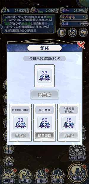 5、我发现了一个能刷世界意志的小窍门。先下线几分钟,这期间可以随意做点别的事,然后再上线。上线后会发现,像灵植、诸神之战这类内容都没有变化,但空间跳跃次数会满3次。这时进行3次空间跳跃,就能获取世界意志以及那些无需等待的奖励啦。