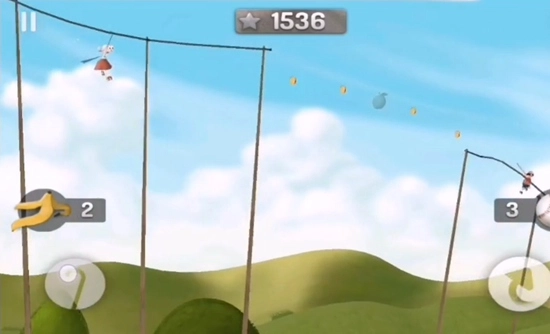 2、游戏里,老奶奶得赶在盗贼之前拿到苹果,同时在行进途中还要赚取能用来购买道具的金币,每次成功跳跃都会得到评价分数。