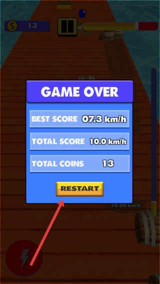 3、当游戏失败后,处于“GAME - OVER”界面时,点击【RESTART】,会消耗一定数量的金币(例如13个),随后即可重新挑战关卡。
