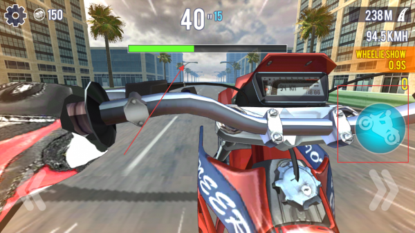3、在游戏进行时,玩家点击屏幕上出现的特技按钮,使摩托车做出特技动作,以此提升游戏得分并增添趣味性。