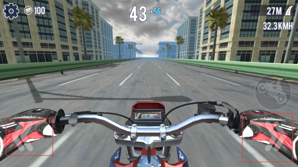 2、玩家进入游戏后,借助屏幕左右两侧形似把手的区域,操控摩托车的方向与平衡,让摩托车在道路上平稳行驶。