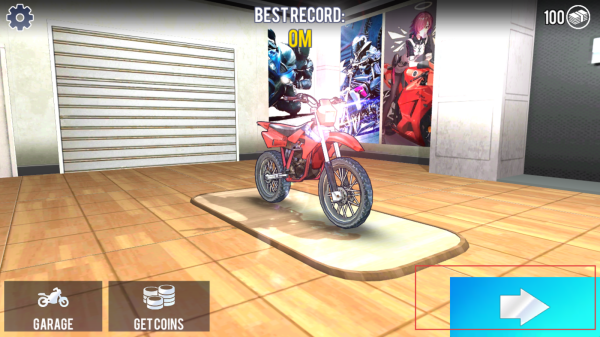 1、玩家完成游戏后点击进入,在初始界面点击右侧蓝色带箭头的按钮,可进入游戏选择摩托车,也能直接开始游戏。