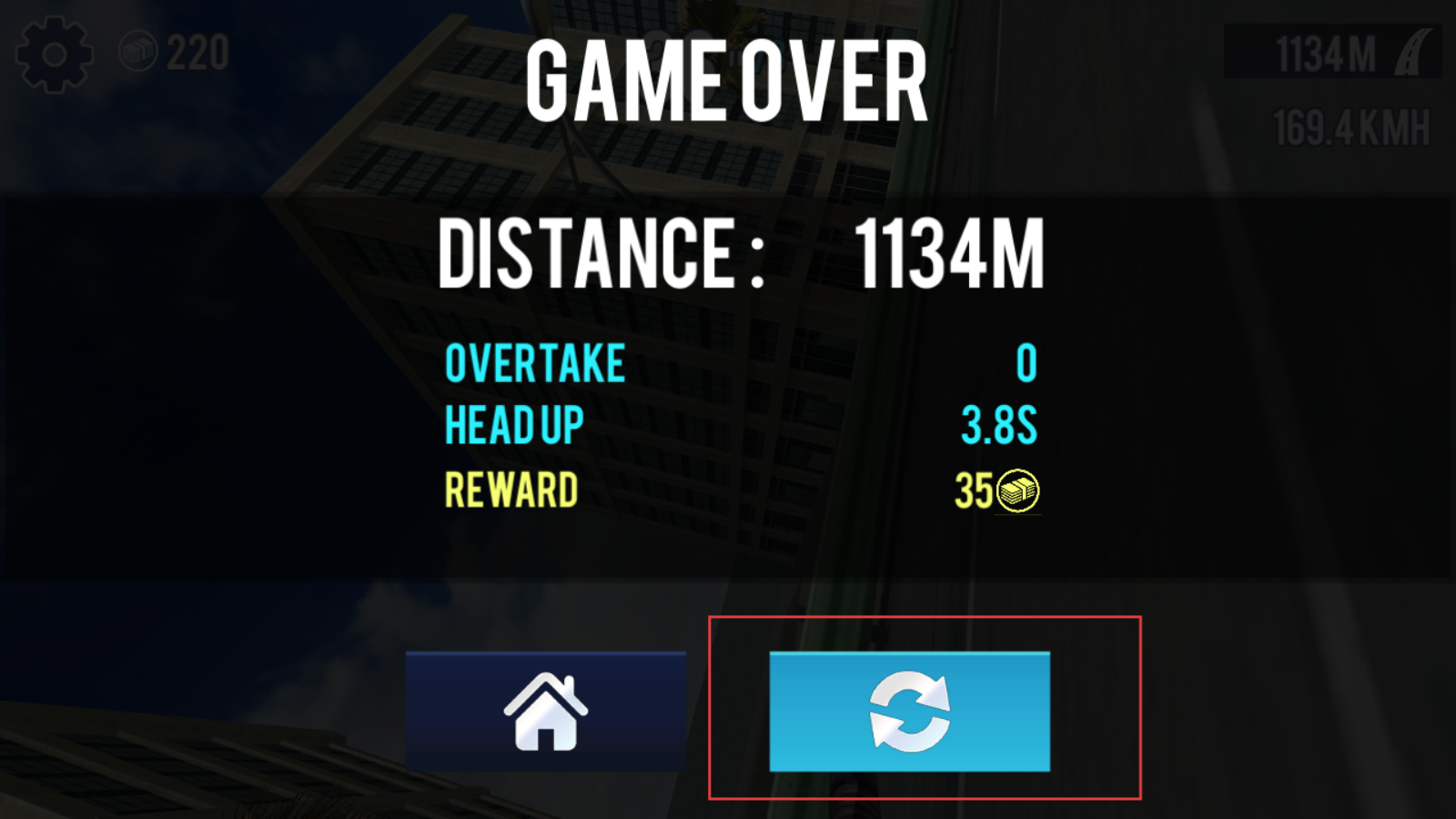 4、游戏结束并显示GAME OVER界面后,点击蓝色带循环箭头的按钮,即可重新开始游戏,持续挑战更远的行驶距离。