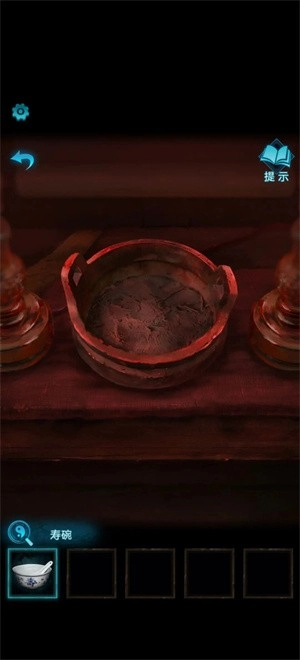 6、总之,打开抽屉,从中拿到碗和勺子。接着查看神龛下方的香炉,会发现香炉有提示,显示里面有东西。此时,用碗把香灰盛出来,这样就能拿到一碗灰和香灰铲。仔细瞧瞧这铲子,它又长又扁,恰好可以用来挑起门栓。
