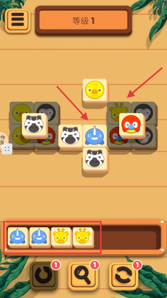 3、当消除遇到阻碍时,选用底部标有【1】的道具来调整方块的位置,以此助力凑齐3个相同动物达成消除。