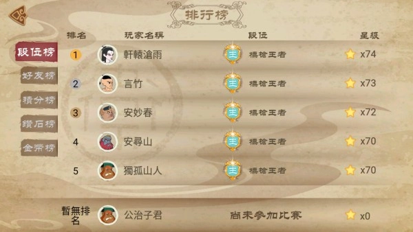 4、这里展示的是该游戏的排行榜,它是依据游戏排位赛的等级来排序的。各位玩家可以在此循序渐进地提升等级,努力冲刺更高排名。