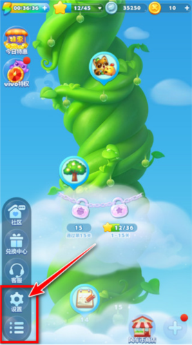 4、接下来教大家怎样绑定微信或QQ账号。进入开心消消乐主页面后,点击左下角的菜单图标,然后选择设置。