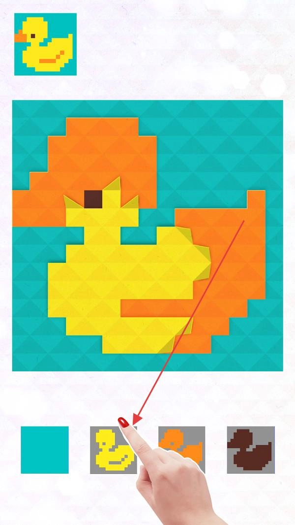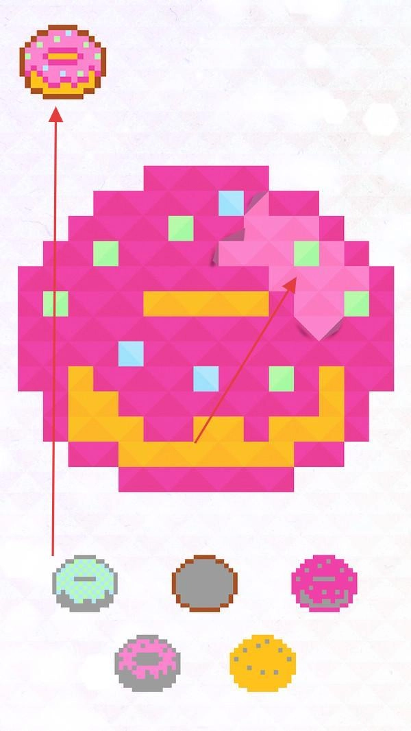进入关卡后,把注意力集中在目标像素图案上(像小黄鸭、甜甜圈这类),与此同时还要留意下方的待选像素块。